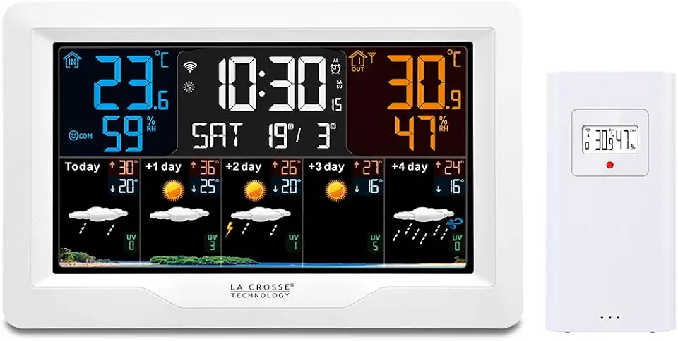 La La Crosse Technology SW403 es una estación meteorológica que combina funcionalidad y diseño en un solo dispositivo. Con su pantalla LCD colorida, esta estación no solo proporciona datos precisos sobre la temperatura y la humedad, sino que también ofrece predicciones del tiempo y un índice UV, todo en un formato fácil de leer. Su capacidad de conectividad Wi-Fi permite que los usuarios se mantengan informados en tiempo real, lo que la convierte en una herramienta esencial para cualquier hogar. Si buscas una forma de estar al tanto de las condiciones climáticas, esta estación meteorológica es la opción ideal.
