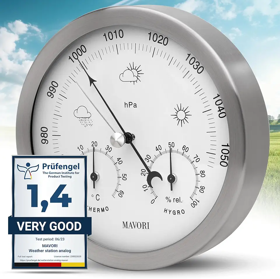 La MAVORI® Estación Meteorológica analógica combina elegancia y funcionalidad en un solo dispositivo. Con un barómetro, higrómetro y termómetro 3en1, ofrece mediciones precisas tanto en interiores como exteriores. Su marco de acero inoxidable de 13,5 cm y cristal acrílico le confieren un diseño moderno que se adapta a cualquier ambiente. No dejes pasar la oportunidad de tener el control del clima a tu alcance, adquiere la tuya hoy mismo.